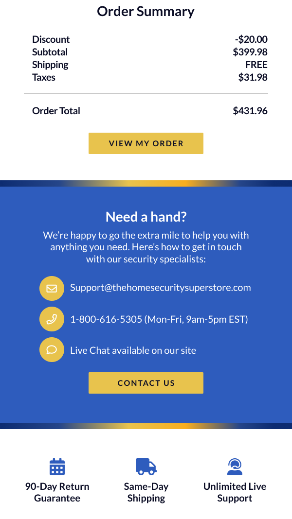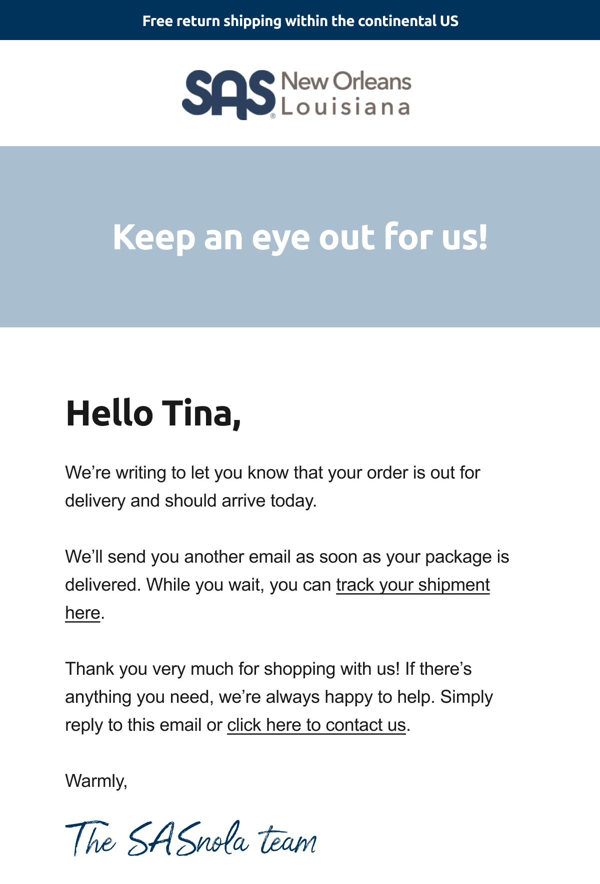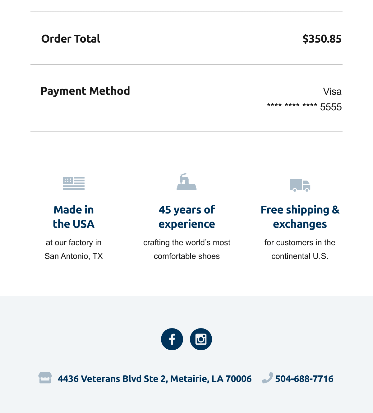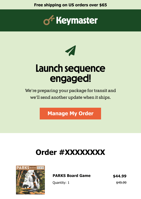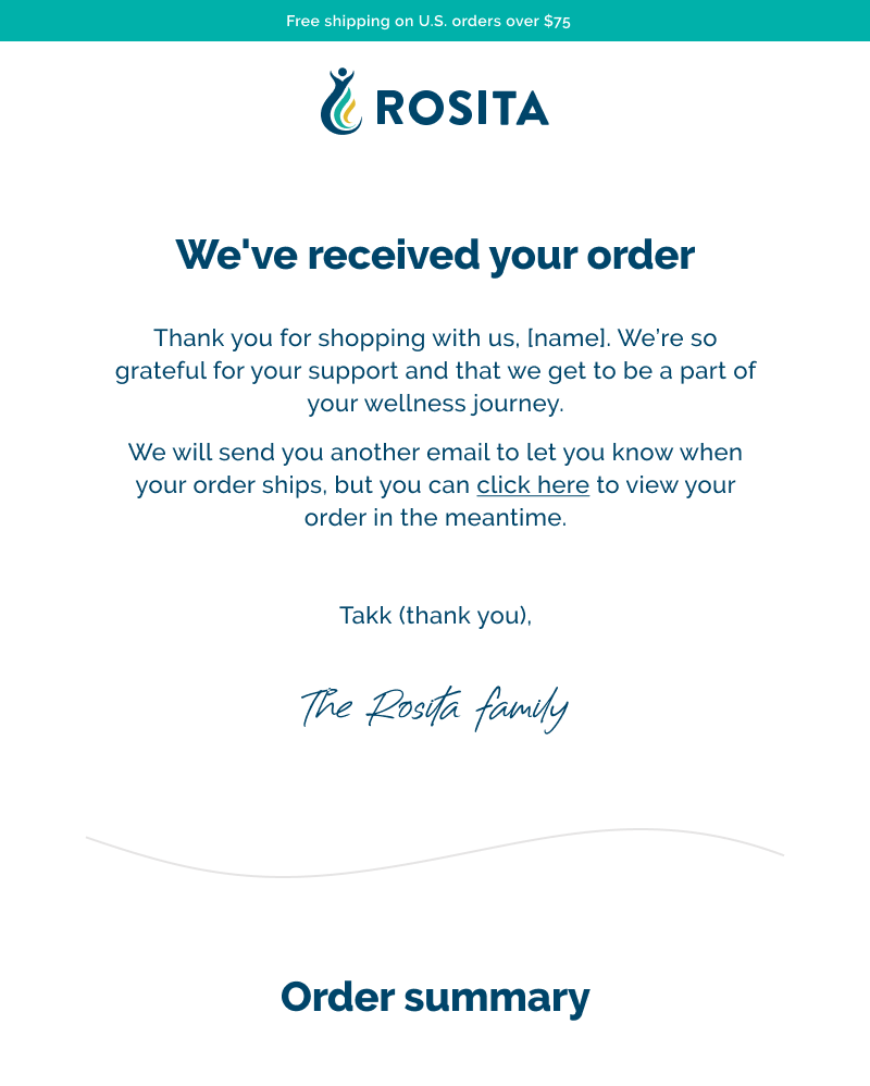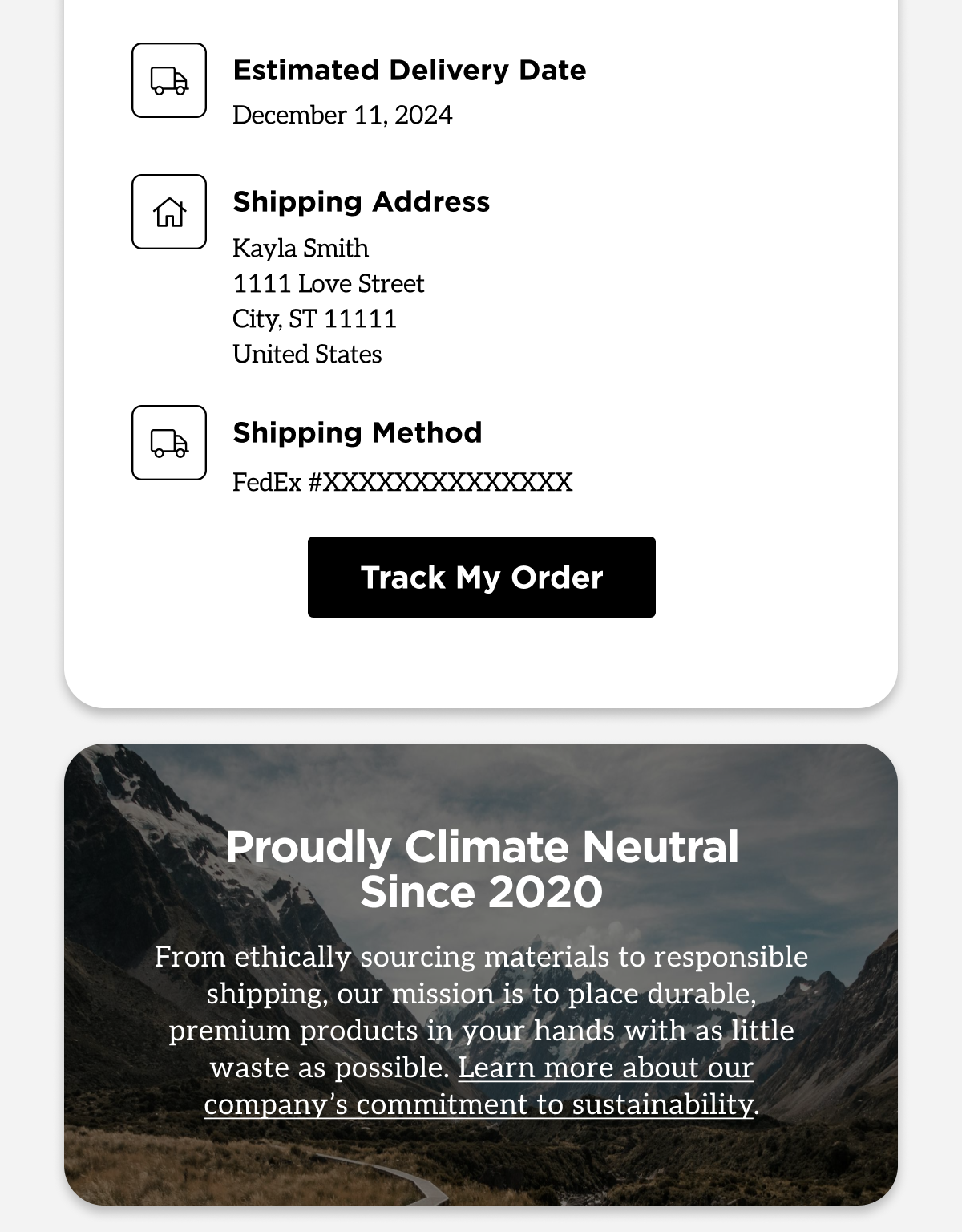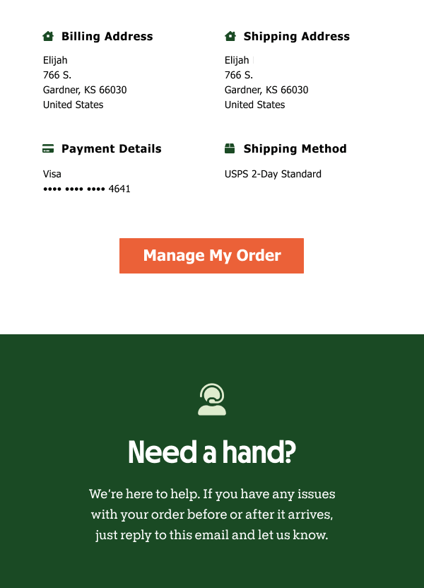 Order confirmation emails garner average open rates of ~70%, and it’s no surprise why. Customers look to these communications for reassurance that they ordered correctly, and are usually eager to open them. These messages should include information such as shipping address, items purchased, and payment confirmation.